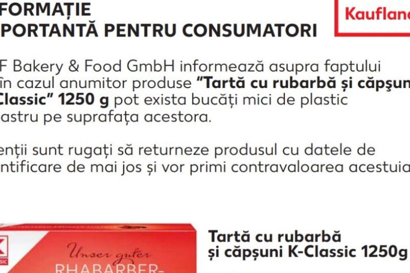 ”B+F Bakery & Food GmbH informează asupra faptului că în cazul anumitor produse «Tartă cu rubarbă şi căpşuni K-Classic» 1250 g pot exista bucăţi mici de plastic albastru pe suprafaţa acestora. Clienţii sunt rugaţi să returneze produsul cu datele de identificare de mai jos şi vor primi contravaloarea acestuia”, este anunţul Kaufland, postat pe site-ul ANSVSA.