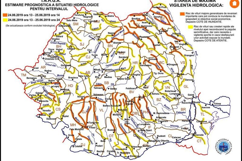Astfel, în intervalul 24.06.2019 ora 13:00 – 25.06.2019 ora 24:00 râurile din bazinele hidrografice Trotuş, Bistriţa, Moldova, Bârlad, Siret – afluenţii mici aferenţi sectorului aval S.H. Huţani, se află sub Cod galben iar în intervalul 24.06.2019 ora 13:00 – 25.06.2019 ora 14:00 râurile din bazinele hidrografice Trotuş, Bistriţa, Moldova, Bârlad – bazin amonte S.H. Vaslui, Siret – afluenţii mici aferenţi sectorului aval S.H. Huţani, amonte confluenţă Trotuş, se află sub Cod portocaliu.Fenomenele se pot produce cu probabilitate și intensitate mai mare pe unele râuri din judeţele: Gorj, Vâlcea, Olt, Suceava, Neamţ şi Bacău. – spun hidrologii