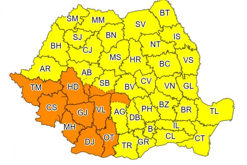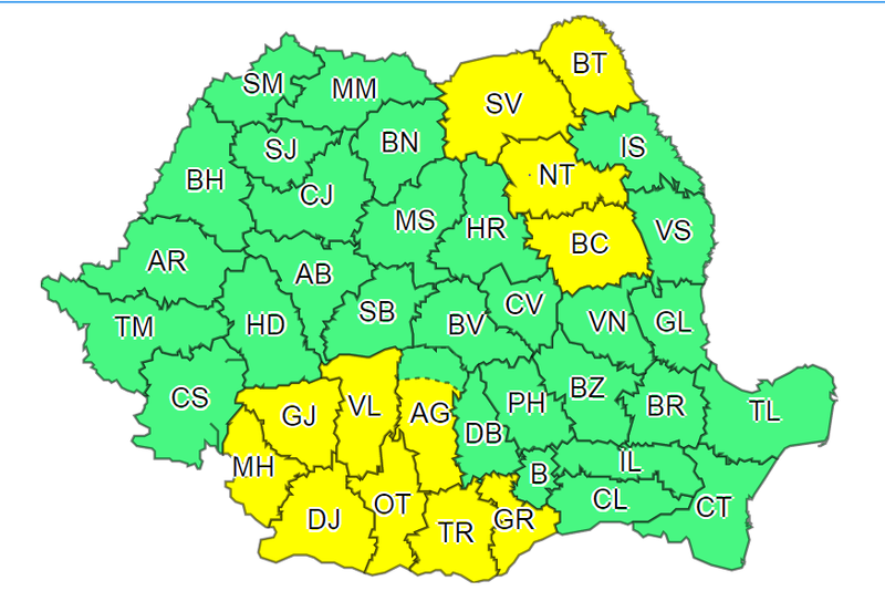 Potrivit meteorologilor, între orele 12:00 și 23:00, în județele Suceava, Botoșani, Neamț, Bacău, Argeș, Dâmbovița, Teleorman, Gorj, Vâlcea, Olt, Dolj, precum și în zona de munte a județelor Vrancea și Prahova instabilitate atmosferică va fi accentuată și se va manifesta prin intervale cu averse torențiale, intensificări ale vântului, vijelii, grindină și frecvente descărcări electrice.În intervale scurte de timp sau prin acumulare, se vor înregistra cantități de apă ce vor depăși 40 l/mp și izolat 50…70 l/mp.