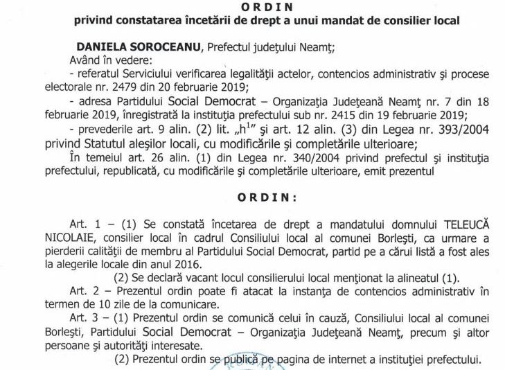 Prefectura Neamț a emis un ordin de încetare a mandatului pentru un consilier local PSD din comuna Borlești.