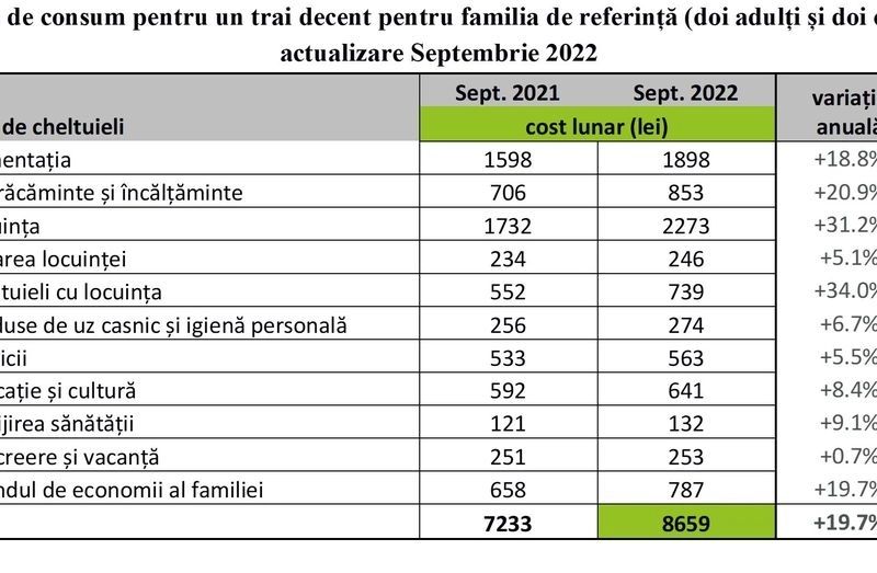 Valoarea coşului minim de consum pentru un trai decent pentru o familie de doi adulţi şi doi copii pentru luna septembrie 2022 este de 8.659 lei pe lună, faţă de 7.233 lei în septembrie 2021, în creştere cu 19,7%, arată datele Fundaţiei Friedrich Ebert România şi Syndex România.