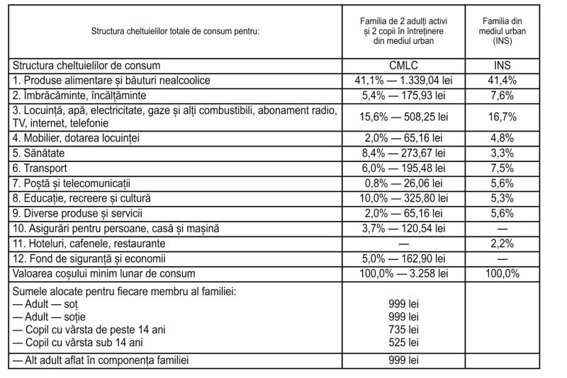 Datele Raportului publicat miercuri sunt de aproape trei ori mai mari decât cele avansate de stat pentru coșul minim de consum. Potrivit Comisiei de Insolvență la Nivel Central o familie de doi adulți și doi copii are nevoie de o sumă de 3.258 lei/lună în mediul urban, pentru coșul minim de consum. Informațiile au fost publicate în Monitorul Oficial, Partea I, nr.973 din 6 octombrie 2022.