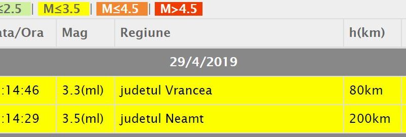 Două cutremure s-au produs luni noaptea, în Neamţ şi Vrancea, la un interval de câteva secunde, conform Institutului Naţional de Cercetare și Dezvoltare pentru Fizica Pământului.