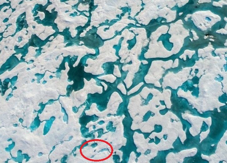 Este vorba despre un urs polar care îşi caută hrană, însă dimensiunile animalului în comparaţie cu cele ale calotei glaciare sunt atât de mici, încât depistarea lui devine aproape imposibilă.