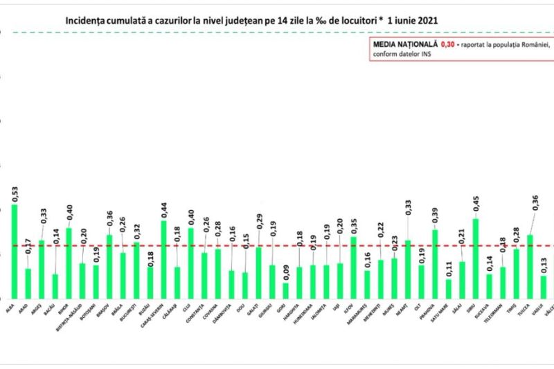 Alba este singurul județ care a depășit în ultimele 24 de ore 0,5 infectări la 1.000 de locuitori, cumulate în ultimele două săptămâni. De asemenea, în mai multe județe, incidența este de cel puțin 0,40 dar până în 0,50: în Sibiu, incidența cumulată este de 0,45, Caraș-Severin - 0,44, în Bihor și Cluj - 0,40, Prahova - 0,39.