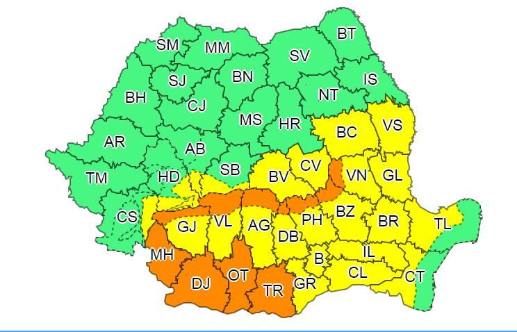 În județele Mehedinți, Dolj, Olt, Teleorman, precum și în zona montană și submontană a județelor Gorj, Vâlcea, Argeș, Dâmbovița, Prahova, Buzău și Vrancea va ploua abundent, iar în intervale scurte de timp sau prin acumulare se vor înregistra cantități de apă ce vor depăși 40 l/mp și izolat 50…70 l/mp.Aversele vor fi însoțite de descărcări electrice, intensificări ale vântului, vijelii și grindină.