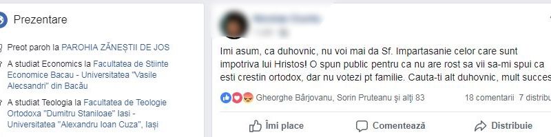 Imi asum, ca duhovnic, nu voi mai da Sf. Impartasanie celor care sunt impotriva lui Hristos! O spun public pentru ca nu are rost sa vii sa-mi spui ca esti crestin ortodox, dar nu votezi pt familie. Cauta-ti alt duhovnic, mult succes!