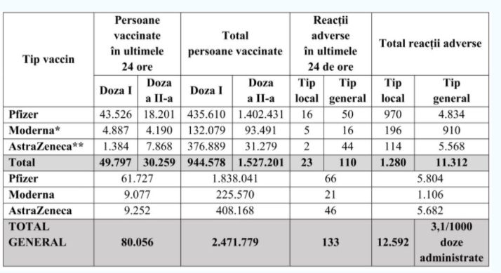 În ultimele 24 de ore, au fost înregistrate 133 de reacţii adverse comune şi minore, dintre care 66 la Pfizer, 21 la Moderna și 46 la AstraZeneca. 23 au fost reacţii de tip local, iar 110 reacţii generale.