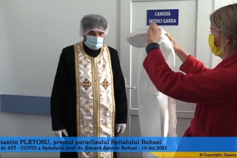 În lupta cu virusul au intervenit și preoții. La Buhuși, în județul Bacău, preotul paroh a îmbrăcat echipamentul de protecție și s-a rugat pentru sănătatea pacienților chiar în saloanele spitalului.