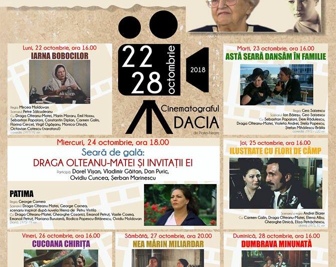 Seara aniversară de miercuri (24 octombrie) face parte din cadrul proiectului cultural DRAGA OLTEANU MATEI – PORTRET CINEMATOGRAFIC, care cuprinde o serie de şapte zile de întâlniri cinematografice, care va debuta luni, 22 octombrie, cu prezentarea filmului „Iarna bobocilor” şi se va încheia duminică, 28 octombrie cu „Dumbrava minunată”.Vor mai rula producţiile: „Astă seară dansăm în familie”, „Ilustrate cu flori de câmp”, „Cucoana Chiriţa” şi „Nea Mărin miliardar”, toate având în rolurile principale pe Draga Olteanu – Matei.Cu excepţia serii aniversare (de miercuri) în toate celelalte zile filmele vor rula de la ora 16:00. Accesul la evenimentul aniversar din 24 octombrie se face pe baza invitaţiilor emise de Centrul pentru Cultură şi Arte „Carmen Saeculare” (strada Ştefan cel Mare, nr. 3A, telefon – 0233.21.40.26).În restul zilelor, intrarea este liberă, în limita locurilor disponibile.