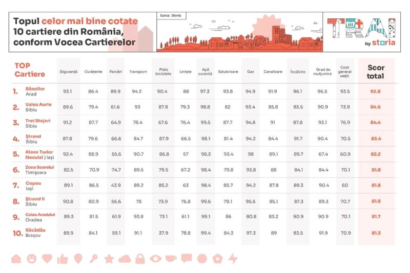 Când vine vorba despre topul celor mai bine cotate 10 cartiere, pe primul loc se regăsește cartierul „Băncilor” din Arad, care a înregistrat punctaje foarte bune în special la criteriile: apă curentă, grad general de mulțumire și încălzire. Pe locul al doilea în acest top este cartierul „Valea Aurie” din Sibiu (84,6), cu punctaje foarte mari la criterii precum apă curentă, sistem alimentare gaze și grad general de mulțumire. Pe următoarele locuri în top se află cartierele „Trei Stejari” (84,4) și „Ștrand” (83,4) din Sibiu și cartierul „Aleea Tudor Neculai” (82,2) din Iași. Cu un scor similar, de 81,8 puncte, se menționează cartierul „Zona Soarelui” din Timișoara, „Copou” din Iași, dar și cartierul „Ștrand II” din Sibiu. Totodată, cartierul „Calea Aradului” (81,7) din Oradea se află pe locul 9 din acest top, urmat pe locul 10 de cartierul „Răcădău” (81,3) din Brașov.
