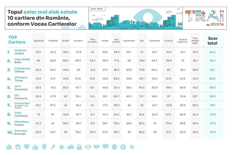 Când vine vorba despre topul celor mai slab cotate 10 cartiere, pe primul loc se regăsește cartierul „Nufărul 2” din Oradea, cu un scor total de 44,2, indicând cele mai negative evaluări, în special din cauza parcărilor, costului general al vieții și curățeniei. Pe locul al doilea în acest top este cartierul „Calea Galați” din Brăila (54,4), care a primit punctaje foarte mici în special la existența pistelor de biciclete, liniște și încălzire. Pe următorul loc în top se regăsește cartierul „2 Moldoveni” (55,1) din Călărași, cu scoruri foarte mici la existența pistelor de biciclete, liniște și curățenie. Următoarele cartiere din top sunt „23 August” (55,9) din Brăila, „Inel 1” (56,9) și „CET” (56,9) din Constanța, dar și „Crihala Sud” (57,1) din Drobeta-Turnu Severin. Pe ultimele trei locuri în acest top, cu același scor, de 57,5 puncte, se regăsesc cartiere precum „Anda” din Constanța, „Mihai Bravu” din Ploiești și „Colentina” din București.