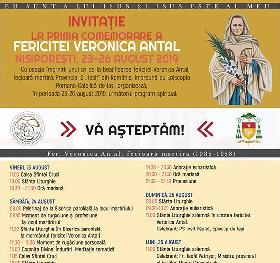 Luni, 26 august, ziua comemorării liturgice a fericitei Veronica Antal, vor fi două Liturghii: la ora 11.00 - celebrant pr. Teofil Petrişor, ministru provincial, şi la ora 18.00 - sfânta Liturghie de seară.
