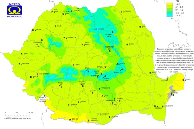 Administrația Națională de Meteorologie (ANM) anunță temperaturi destul de scăzute, mai ales dimineața, acestea fiind cuprinse între 8 și 10 grade, în timp ce la munte, minimele vor coborî sub 0 grade, înregistrându-se temperaturi negative de -1 sau chiar -2 grade.