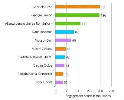 Datele centralizate de raport o plasează pe Gabriela Firea pe prima poziție, cu un engagement de 198.000.