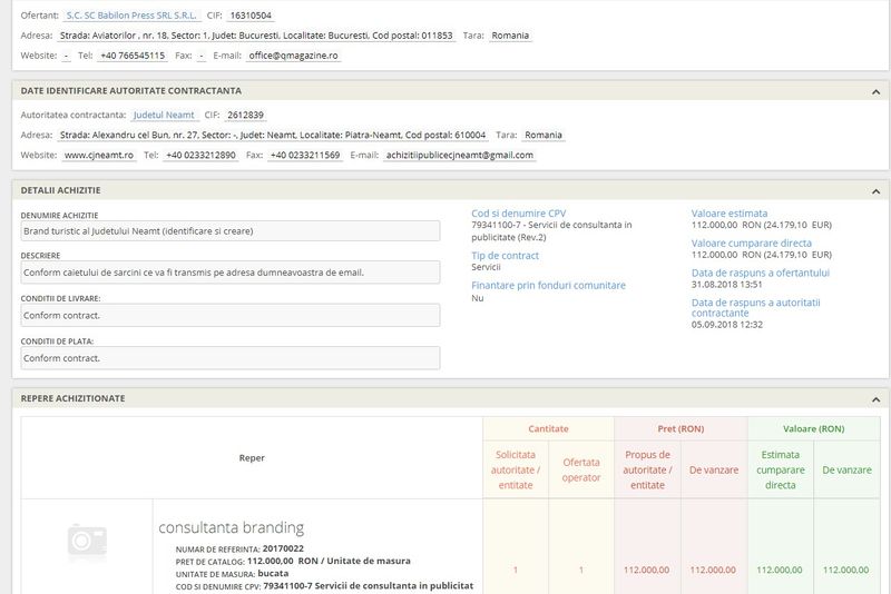 Conform unui anunț postat în Sistemul Electronic de Achiziții Publice (SEAP), firma care a câștigat contractul, în valoare de 112.000,00 RON (24.179,10 euro) FĂRĂ TVA, este SC Babilon Press SRL.Anunțul a fost postat pe data de 31 august 2018, iar câteva zile mai târziu (pe 5 septembrie) contractul a fost atribuit firmei respective.