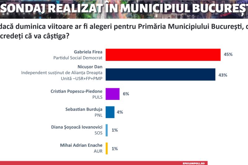 Aceste cifre sugerează o cursă strânsă pentru funcția de primar al Capitalei, cu Gabriela Firea și Nicușor Dan aproape la egalitate.