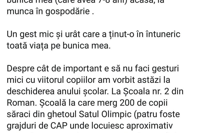 ”Bunica mea a fost analfabetă. Asta, pentru că, acum 100 de ani, străbunica mea a dat șpagă o găină învățătorului din sat ca să o țină pe bunica mea (care avea 7-8 ani) acasă, la munca în gospodărie .Un gest mic și urât care a ținut-o în întuneric toată viața pe bunica mea.Despre cât de important e să nu faci gesturi mici cu viitorul copiilor am vorbit astăzi la deschiderea anului școlar. La Școala nr. 2 din Roman. Școală la care merg 200 de copii săraci din ghetoul Satul Olimpic (patru foste grajduri de CAP unde locuiesc aproximativ 1000 de oameni, dintre care 300 de copii) din Roman.Această școală este cea mai importantă din oraș, chiar dacă este cea mai “izolată” și chiar dacă și profesorii, și copiii ei sunt stigmatizați.Această școală este unitatea cu cel mai mare abandon școlar din oraș. Dar am întâlnit acolo profesori și educatori dedicați. Și copii dornici de a învăța.Au și WC-uri bune. Spre deosebire de școala unde am început clasa I, acum aproape 25 de ani, unde copiii încă merg afara.Succes, dragi copii! Curaj, dragi părinți!Să nu cădeți in ispita de a face gesturi mici cu viitorul copiilor voștri. Fericirea lor nu e de vânzare”, este mesajul postat de deputatul USR , Iulian Bulai , pe Facebook.