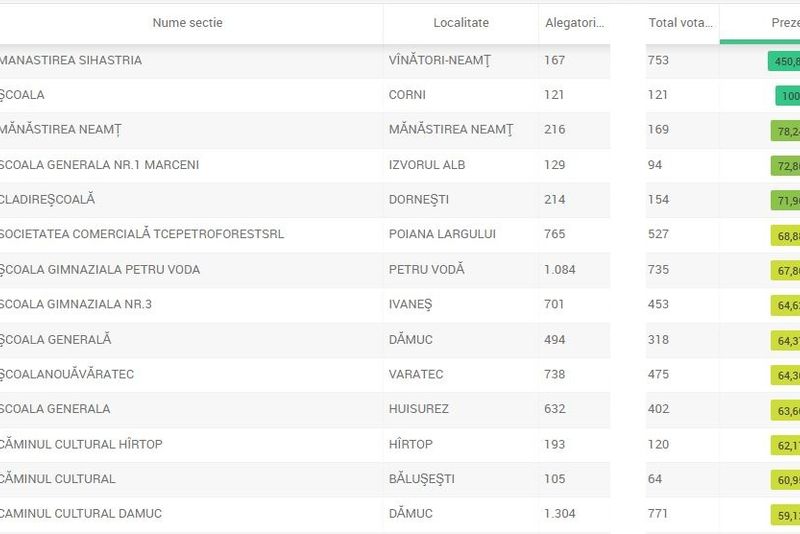 Cea mai mare prezență s-a înregistrat la secțiile de votare din: – VÎNĂTORI-NEAMŢ (MANASTIREA SIHASTRIA) – 450,89 % – CORNI – 100 % – MĂNĂSTIREA NEAMŢ – 78,24 % – IZVORUL ALB – 72,86 % – DORNEŞTI – 71,96 %Reamintim că secția de votare care se află la Mănăstirea Sihăstria (comuna Vânători-Neamț), este secția cu cel mai mare procent din țară la prezența la vot. Atât ieri cât și astăzi s-au prezentat 753 persoane, 630 fiind pe liste suplimentare.
