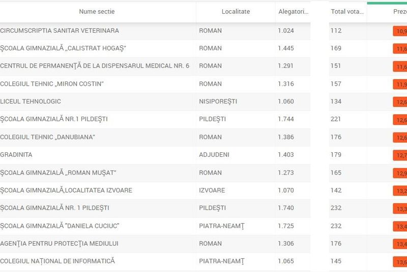 La polul opus, 4 secții din municipiul Roman au înregistrat cel mai mic procentaj: – ROMAN – 10,93 % (CIRCUMSCRIPTIA SANITAR VETERINARA) – ROMAN – 11,69 % (ŞCOALA GIMNAZIALĂ ,,CALISTRAT HOGAŞ”) – ROMAN – 11,69 % (CENTRUL DE PERMANENŢĂ DE LA DISPENSARUL MEDICAL NR. 6) – ROMAN – 11,93 % (COLEGIUL TEHNIC „MIRON COSTIN”)
